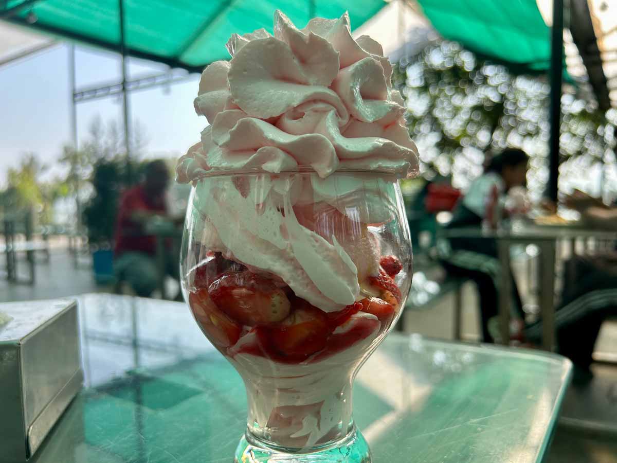 We arrived at Mapro Garden around 8 am. The air was already filled with the sweet, signature aroma of strawberries, chocolates, jellies, and juices. This place is a perennial favourite, bustling with families, couples, and groups – a vibrant atmosphere. We were all eager for a hearty breakfast: pizzas, sandwiches, and the much-loved strawberry or mango cream creations.